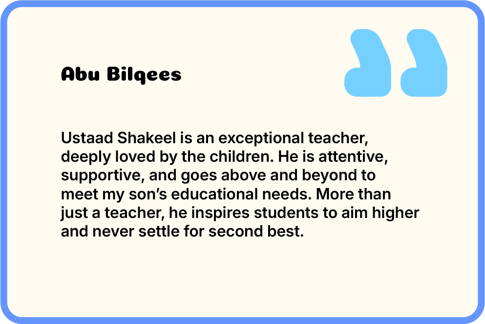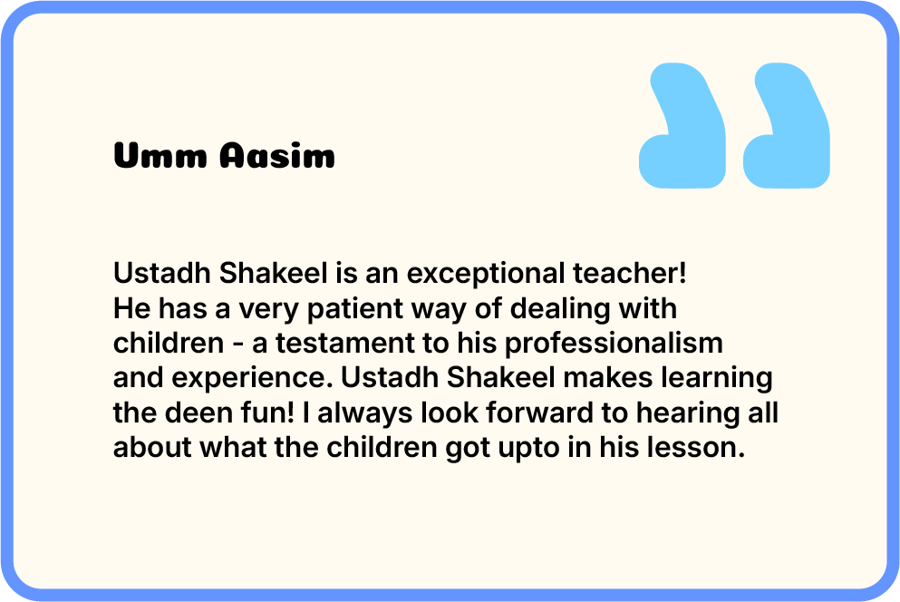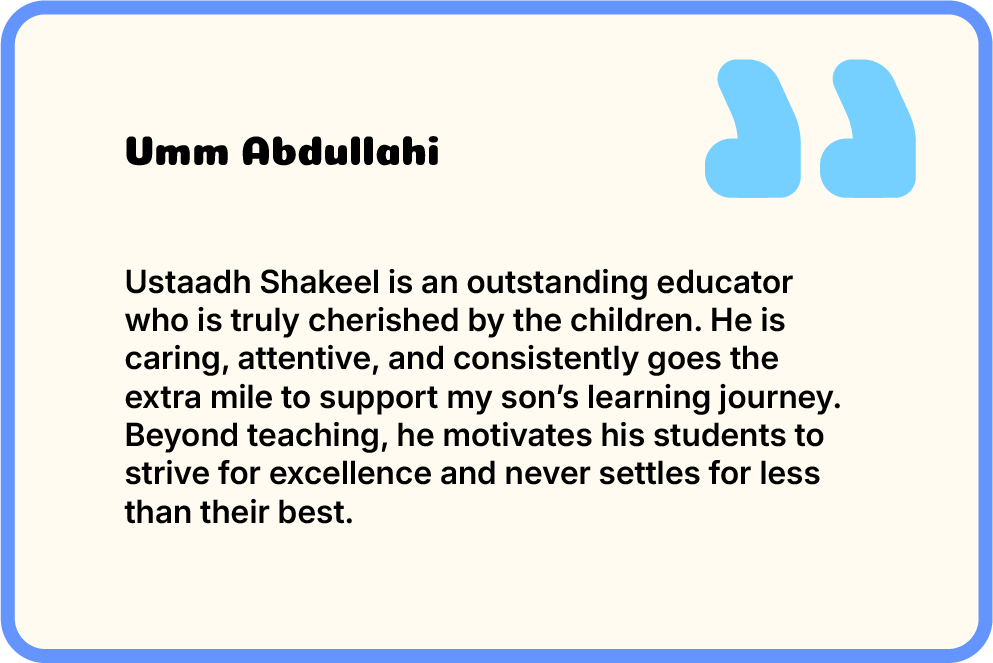 Ustadh Shakeel is a passionate Islamic educator with over a decade of experience specialising in Islamic Studies for primary school children. Over the past ten years, he has taught hundreds of students and guided hundreds of parents in nurturing their children’s faith and Islamic identity. He delivers essential knowledge through creative, engaging methods that make learning practical, relatable, and easy for children to grasp, while building their confidence and character. Alongside his teaching, he delivers sermons, leads Tarāwīḥ prayers, and has studied various foundational Mutoon and introductory Tafāsīr under qualified teachers. He also holds an Ijāzah in Riwayah Ḥafṣ ʿan ʿĀṣim, inspiring the next generation of Muslims.